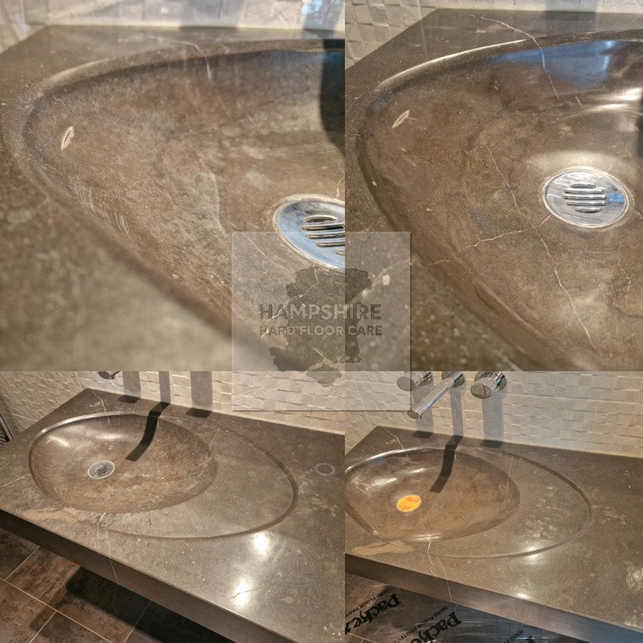 At Hampshire Hard Floor Care, our deep-cleaning process removes the grease, residue, limescale, and cosmetic build-up that everyday kitchen and bathroom use leaves behind. We begin by protecting surrounding areas, then apply specialist stone-safe cleaners formulated specifically for worktops and vanity units.